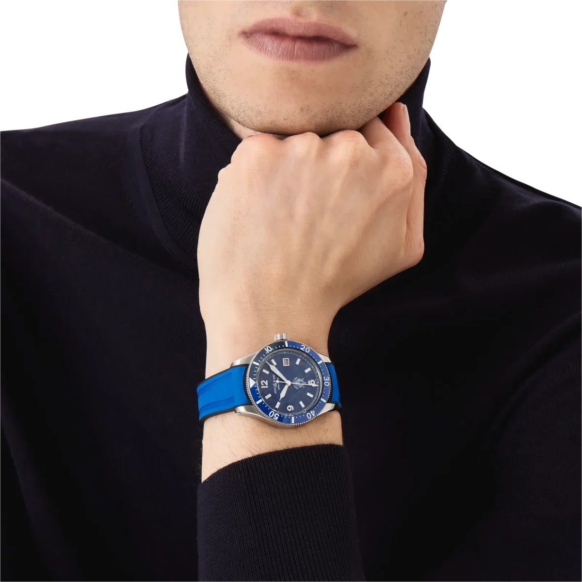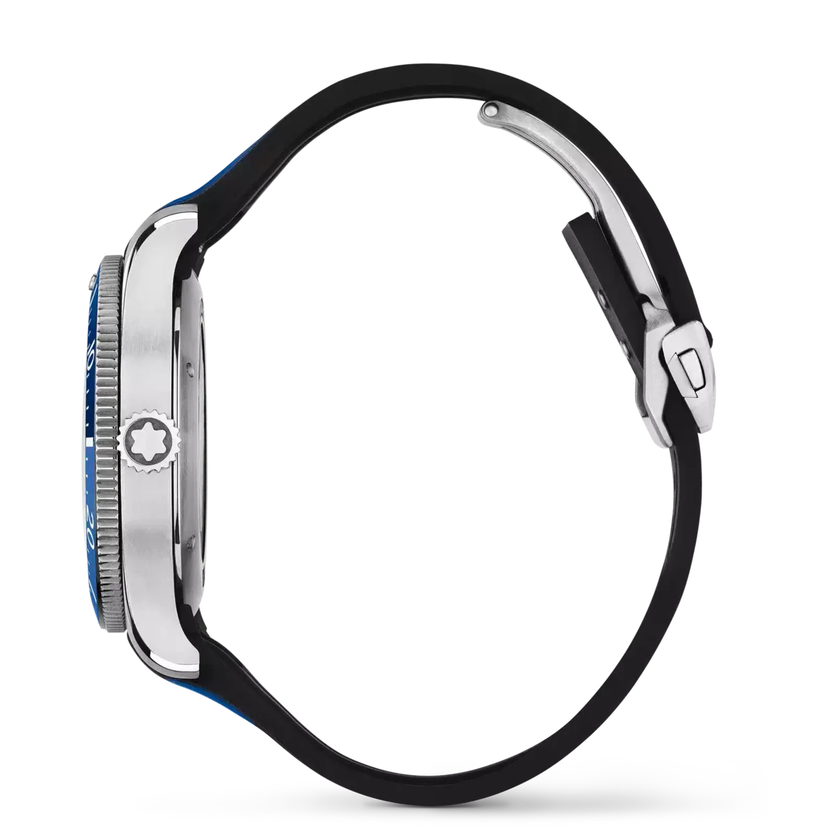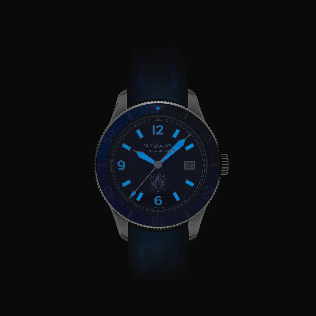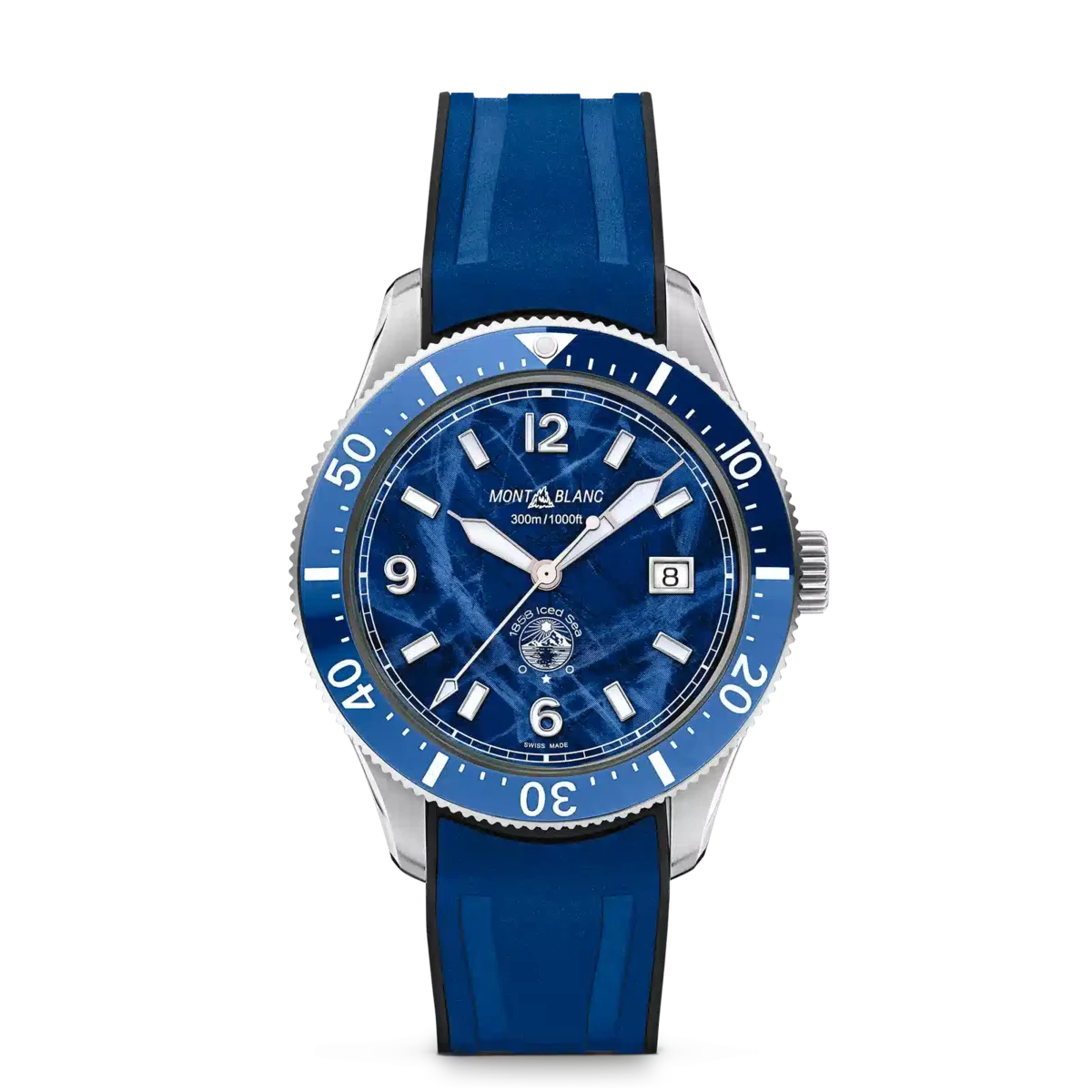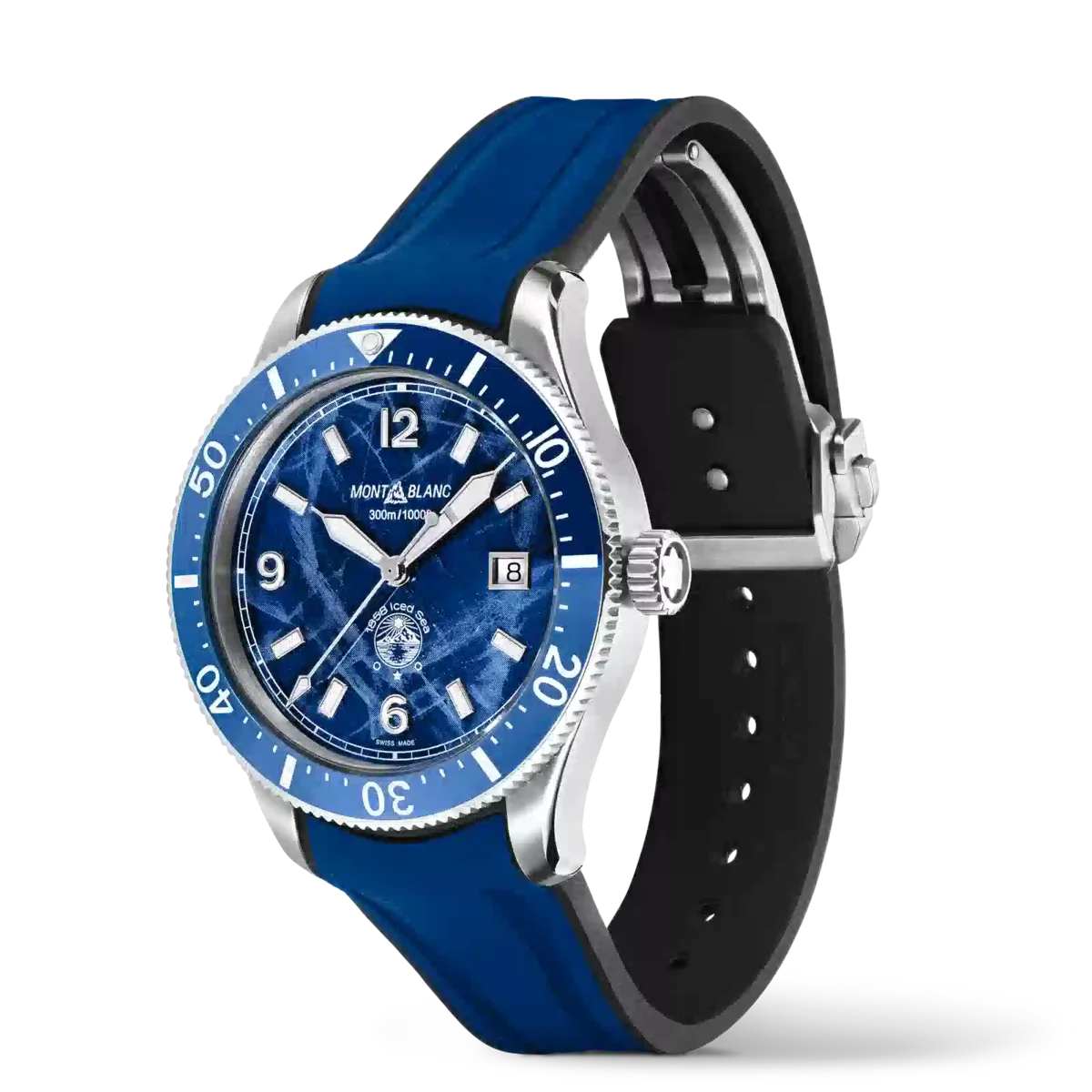 The first-ever sports diving watch for Montblanc, the Montblanc Iced Sea Automatic Date features a glacier pattern dial that gives the impression of looking into the depths of a glacier. This blue glacial pattern dial is inspired by the Mer de Glace – Sea of Ice – the main glacier of the Mont-Blanc Massif. Its texture was achieved using an almost-forgotten ancestral technique called gratté-boisé. The timepiece is housed in a 41mm stainless steel case and comes with a unidirectional bi-colour ceramic bezel, an engraved case back, and an interchangeable blue rubber strap with fine adjustment system. The timepiece conforms to the ISO 6425 norm for diving watches and is water-resistant to 300 metres.