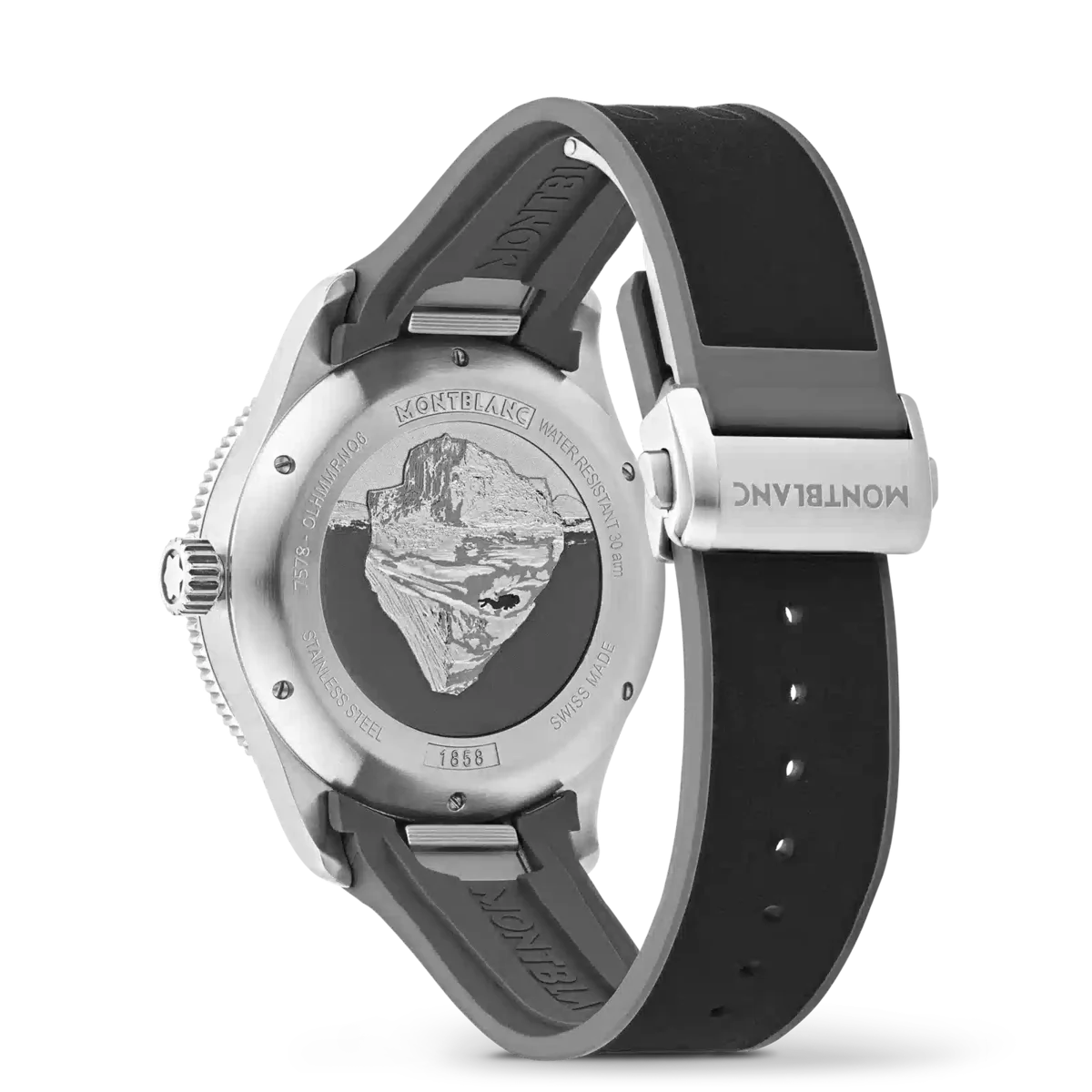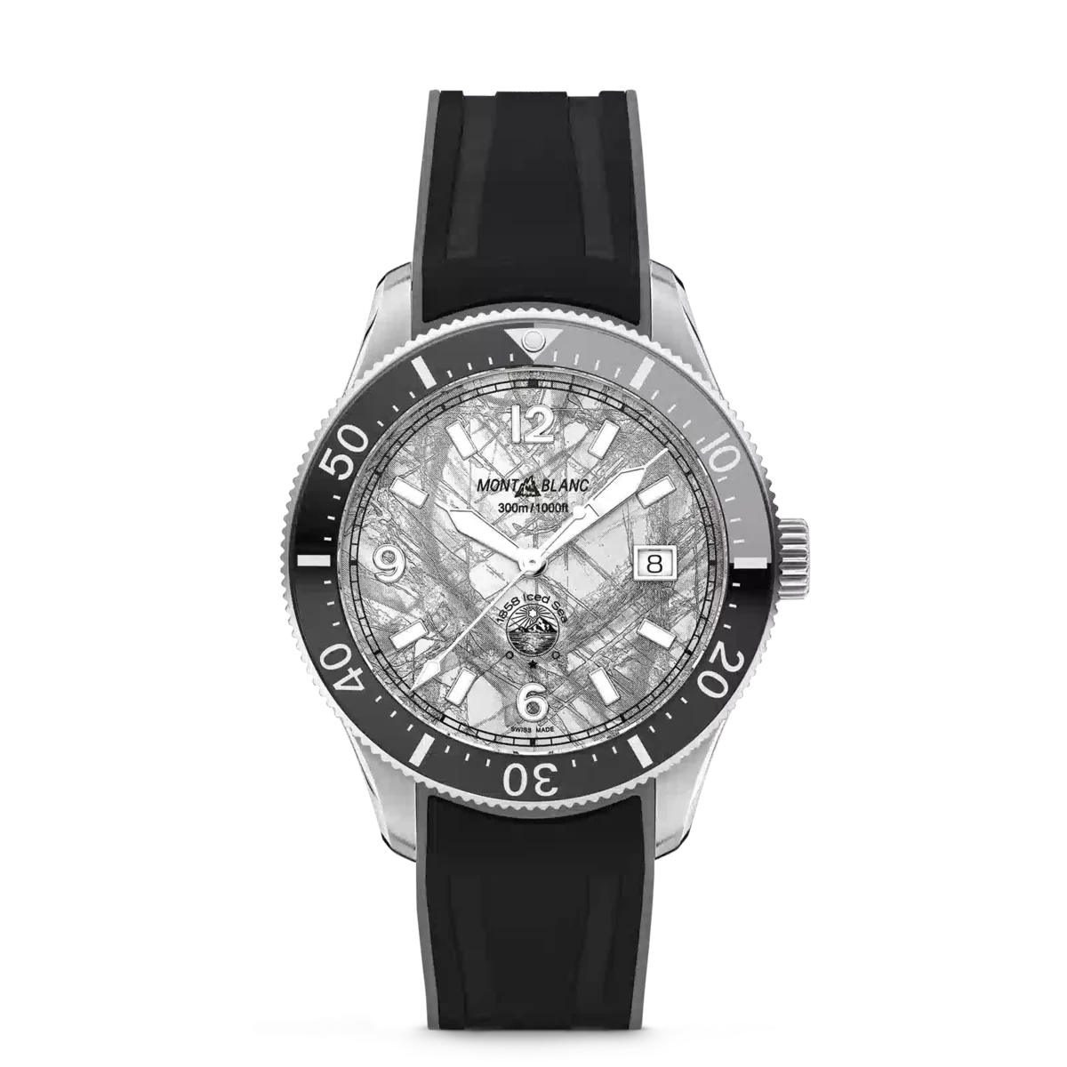 The Montblanc Iced Sea Automatic Date with grey glacier pattern dial gives the impression of looking into the depths of a glacier with all its minerals captured in time for millennia. Inspired by the Mer de Glace, this glacial texture was achieved using an almost-forgotten ancestral technique called gratté-boisé. The 41mm timepiece comes with a black interchangeable rubber strap with grey outline which can be quickly and easily switched for a stainless steel bracelet without the need to return to the boutique or the use of any tools. It is also adjustable on the wrist when wearing the watch for diving. The timepiece conforms to the ISO 6425 norm for scuba diving and comes with a water resistance of 300 metres and features luminescent markings for reading in low light.