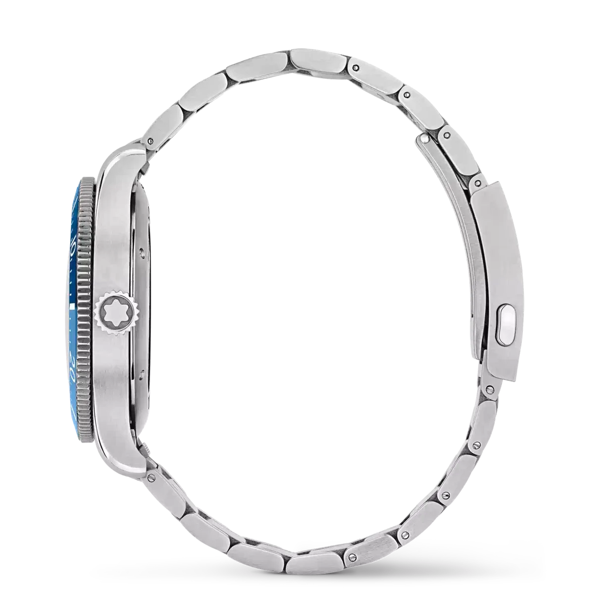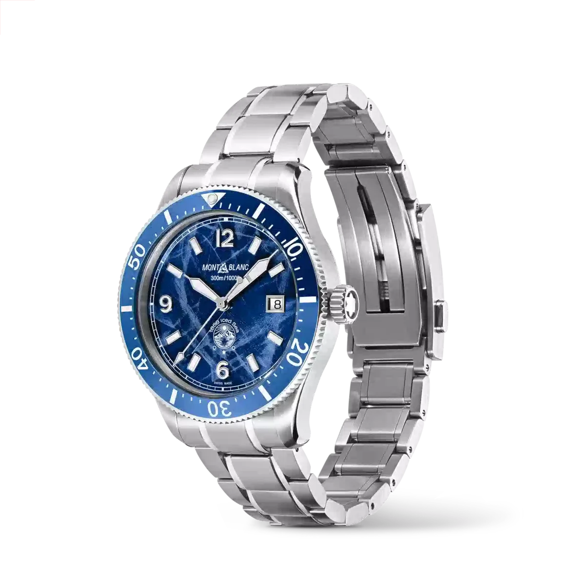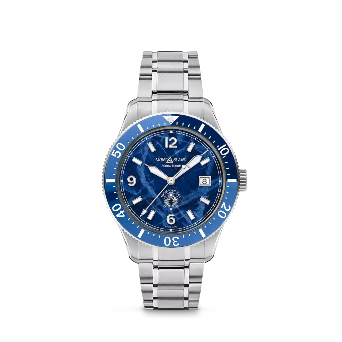 The first-ever sports diving watch for Montblanc, the Montblanc Iced Sea Automatic Date features a glacier pattern dial that gives the impression of looking into the depths of a glacier. This blue glacial pattern dial is inspired by the Mer de Glace – Sea of Ice – the main glacier of the Mont-Blanc Massif. Its texture was achieved using an almost-forgotten ancestral technique called gratté-boisé. The timepiece is housed in a 41mm stainless steel case and comes with a unidirectional bi-colour ceramic bezel, an engraved case back, and a tapered interchangeable stainless steel bracelet with fine adjustment for precision fitting. The timepiece conforms to the ISO 6425 norm for diving watches and is water-resistant to 300 metres.