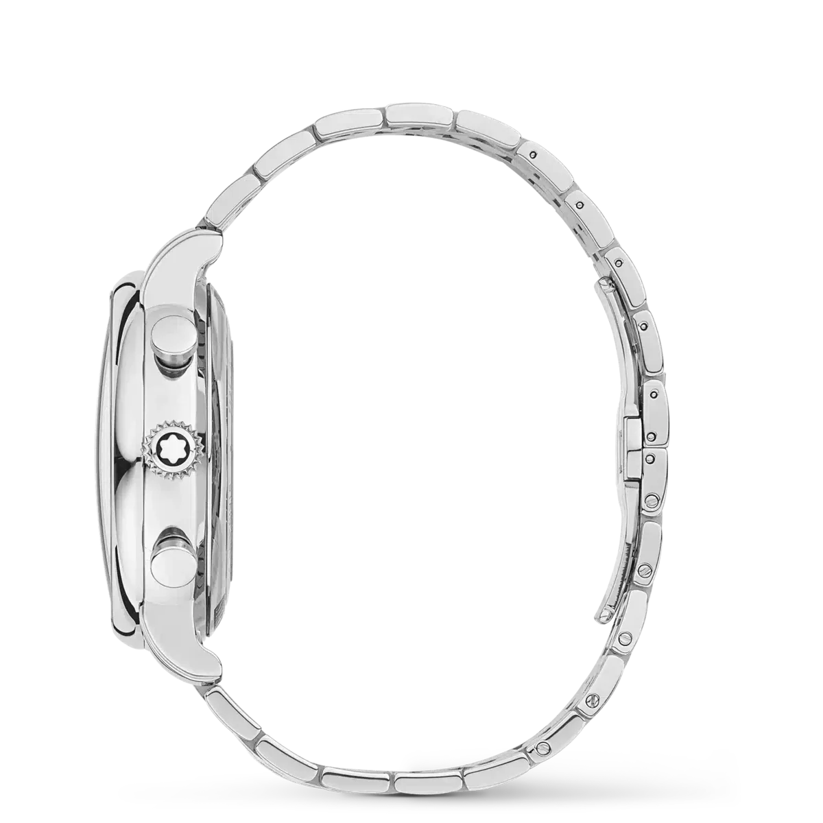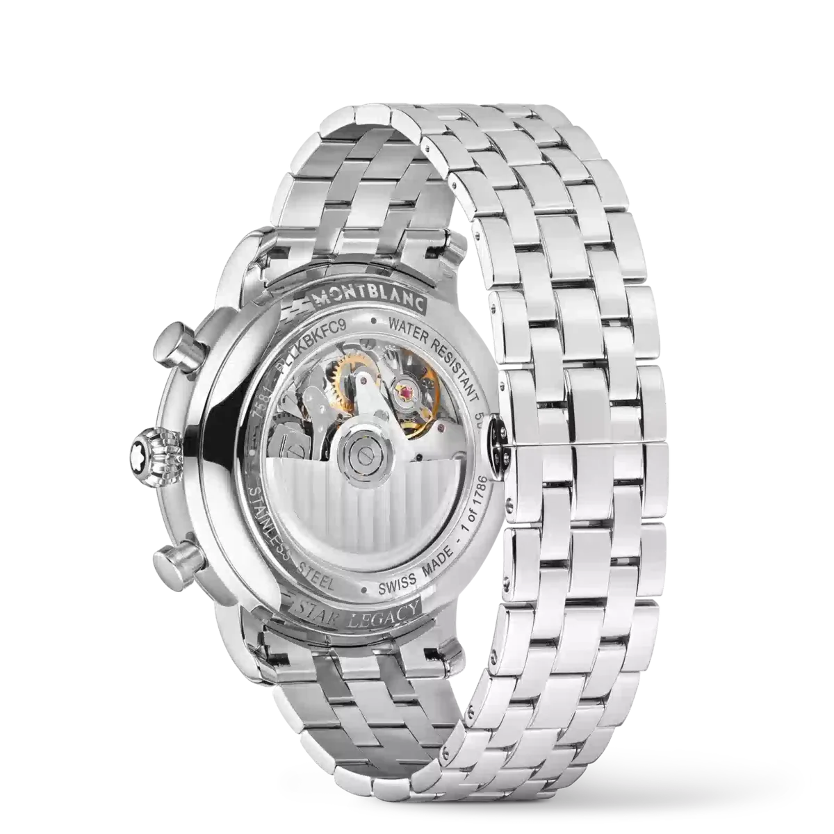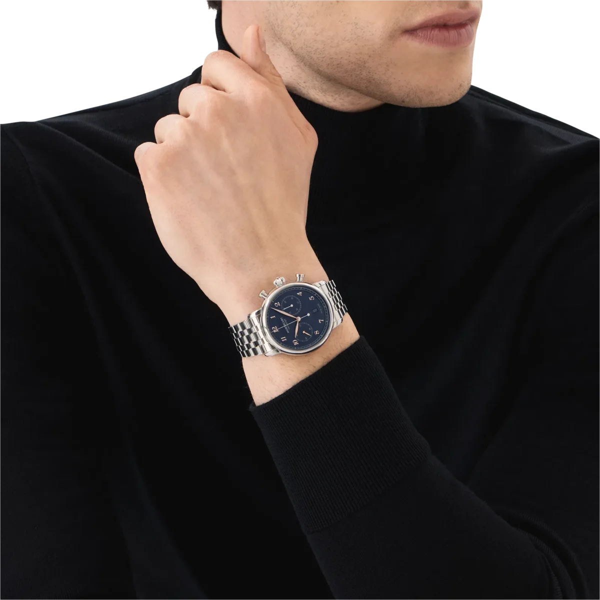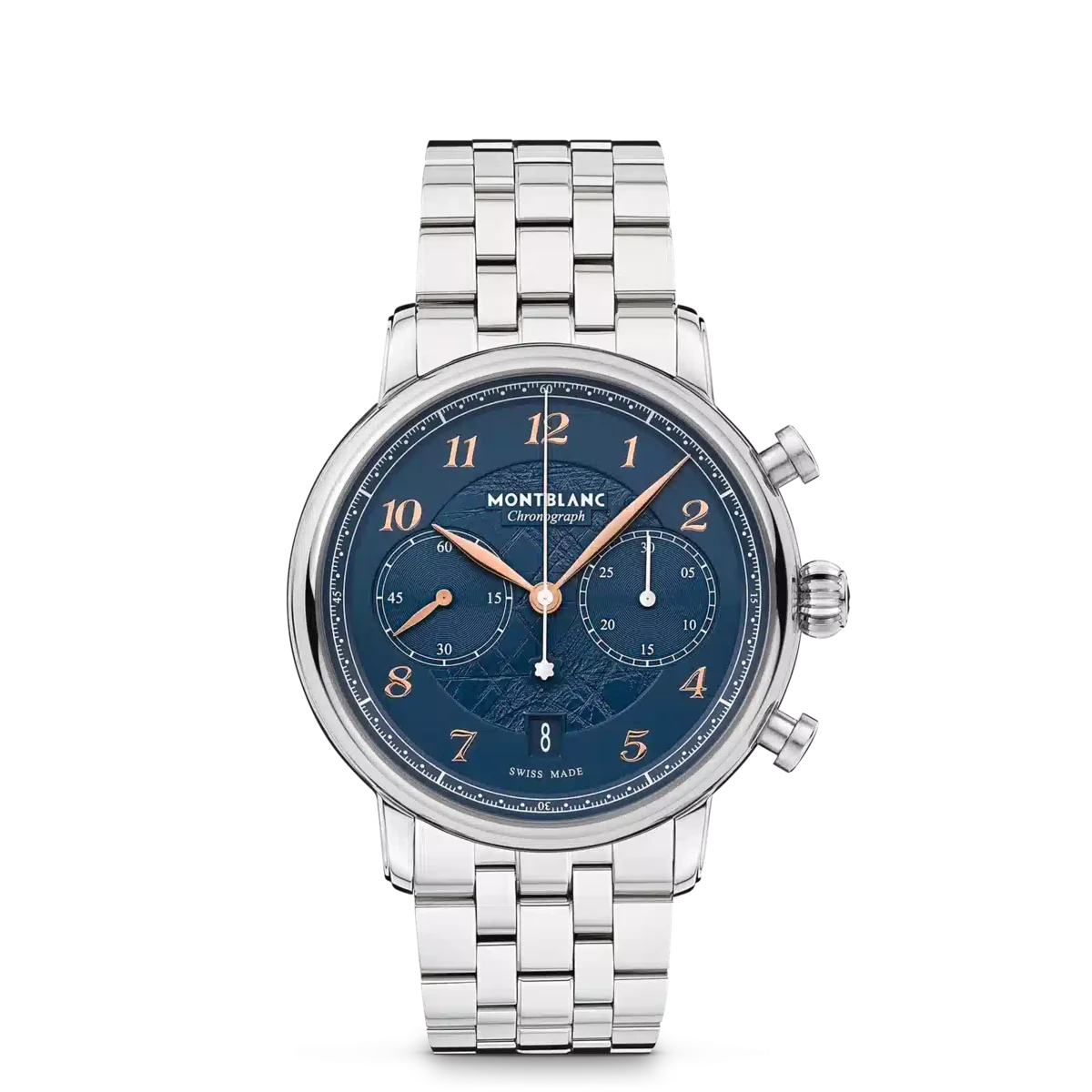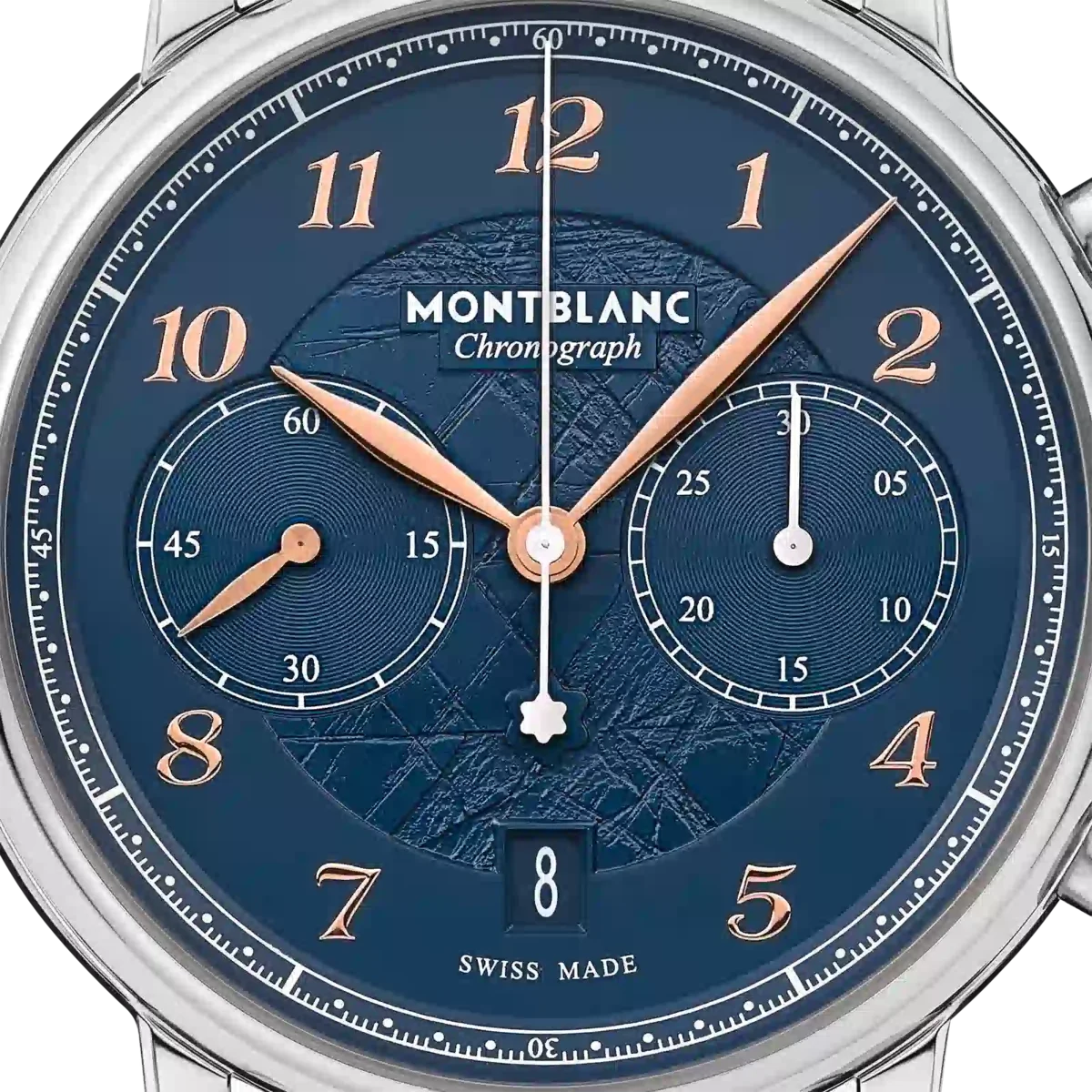 The Montblanc Star Legacy Chronograph is limited to 1786 pieces and comes in a 42mm pebble-shaped stainless steel case with rose gold-coated Arabic numerals and an eye-catching blue glacier pattern dial. The dial is decorated with a layered ice design that was inspired by the Mer de Glace, the main glacier of the Mont-Blanc Mountain. The center of the dial is created using a special stamp that reproduces this glacier texture and celebrates the “blue hour” – “l’heure bleue”, during which a shade of intense blue falls upon the glacier at dusk when the moon rises and the stars begin to shine. It was at this time of day that Jacques Balmat became the first person to reach the summit of the Mont Blanc – at 18h23 on August 7th in, 1786. Functions include hours, minutes, central seconds with a Montblanc emblem on the counterweight, chronograph, and a date that are powered by the MB 25.13 automatic movement that can be admired through a sapphire crystal case back. The time functions are displayed with rose gold-coated leaf-shaped hands, while the chronograph indications use rhodium-coated “baton” hands. The timepiece is paired with a stainless steel bracelet.
