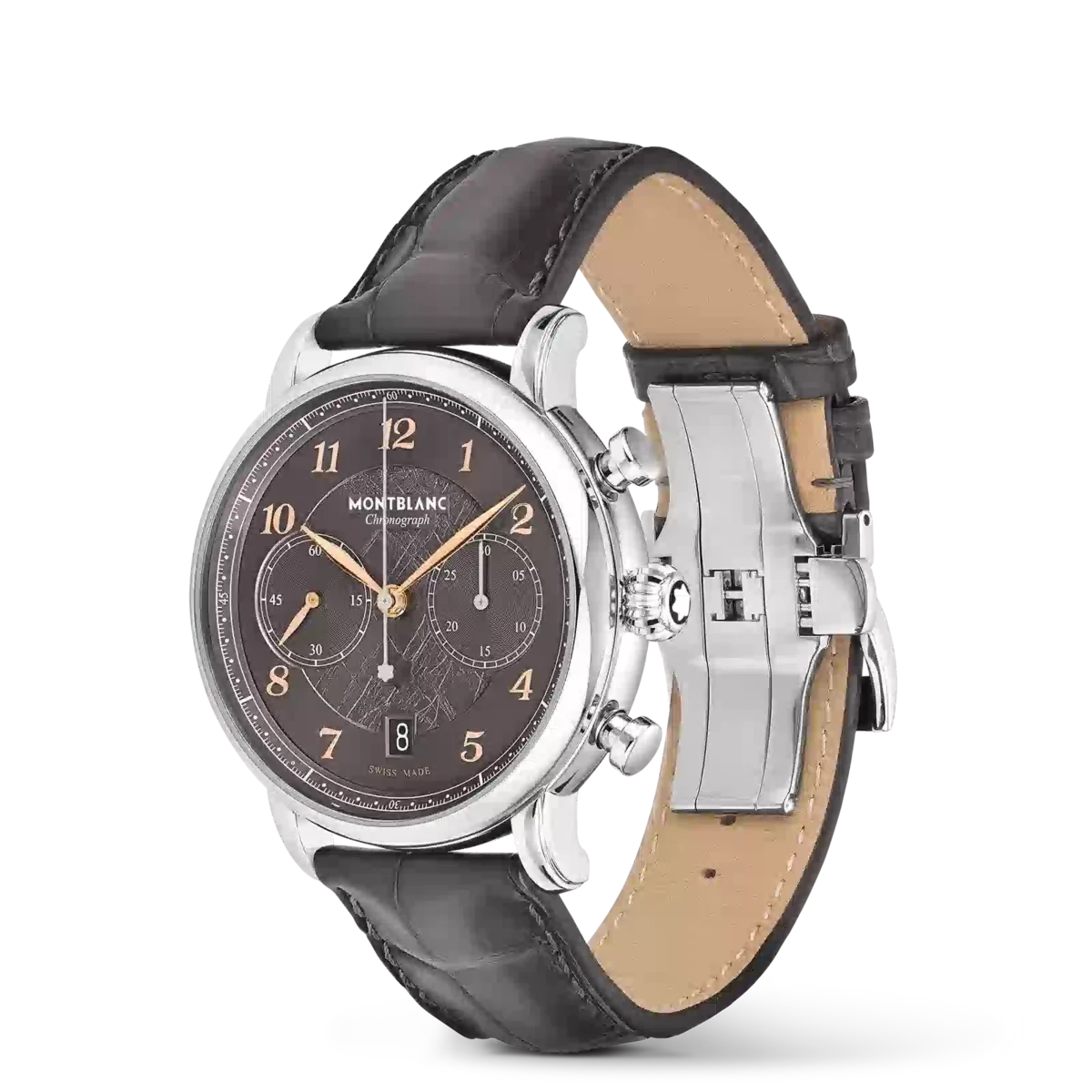 The Montblanc Star Legacy Chronograph Limited Edition of 1786 pieces comes in a 42mm stainless steel case that highlights a new facet of the Mont Blanc – its south-facing rocky side. This timepiece comes with two chronograph counters at three and nine o’clock for an elegant look and important legibility. The gray glacier pattern can be perceived in the background, while the filet sauté has been replaced with an inner flange to bring volume to the dial. The time functions are displayed with rose-gold coated, leaf-shaped hands, while the chronograph indications use rhodium-coated “baton” hands. The timepiece comes on an interchangeable gray calf leather strap with an alligator print.