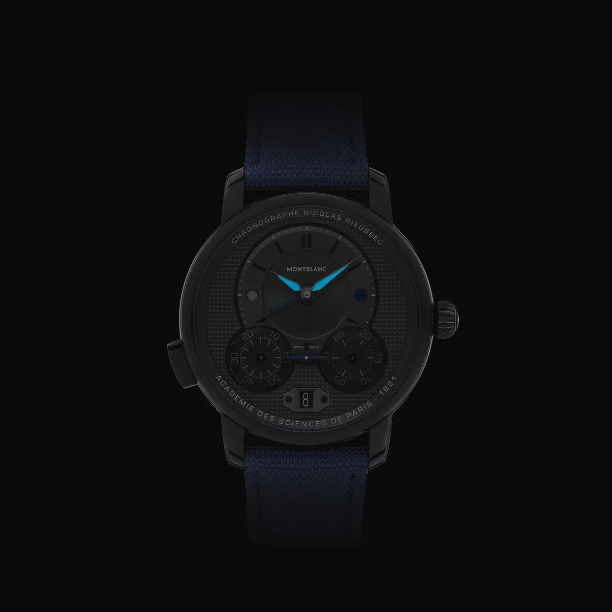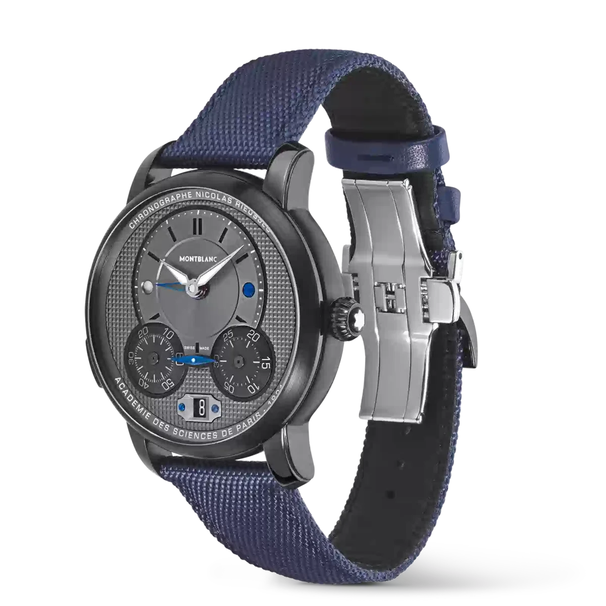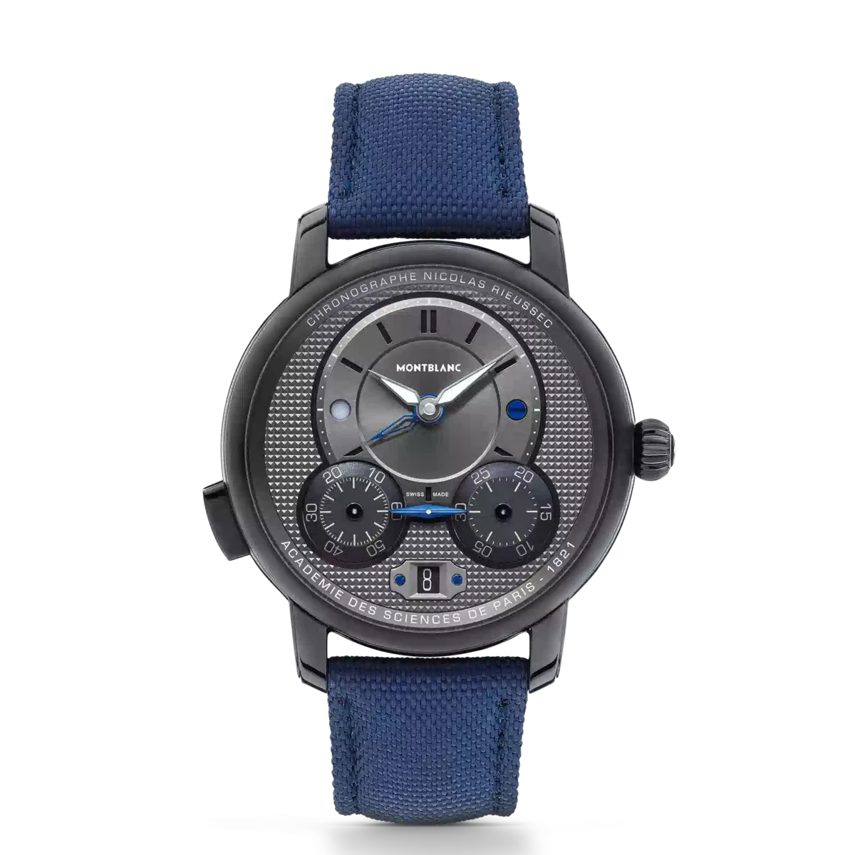 The Montblanc Star Legacy Nicolas Rieussec Chronograph 43mm Limited Edition pays tribute to the inking chronograph invention first tested by Nicolas Rieussec in 1821 in Paris and validated by the Académie des Sciences. This new iteration comes in a 43mm DLC-coated stainless steel case with a black dial. Clou de Paris motifs can be found on the dial, oscillating weight, and blue textile strap that are reminiscent of Paris’s cobbled streets. Functions include a chronograph, day & night indication, second time zone, and a date. The timepiece is powered by the MB R200 Montblanc Manufacture monopusher chronograph movement and is limited to 500 pieces.