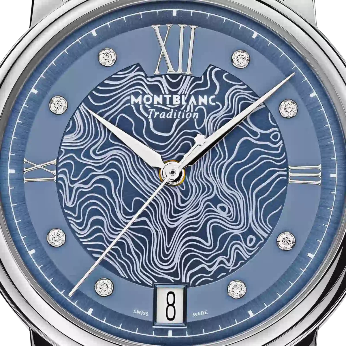 The Montblanc Tradition Automatic Date comes in a 32 mm stainless steel case with straight horns and a double-shaped bezel. The timepiece features a blue dial depicting the topography of the Mont Blanc with diamond indexes, silver-colored Roman numerals and a prominent Roman “XII”. The sword-shaped hour and minute hands, the seconds hand and crown with Montblanc emblem and the blue interchangeable calf leather strap complete its contemporary elegant appearance.