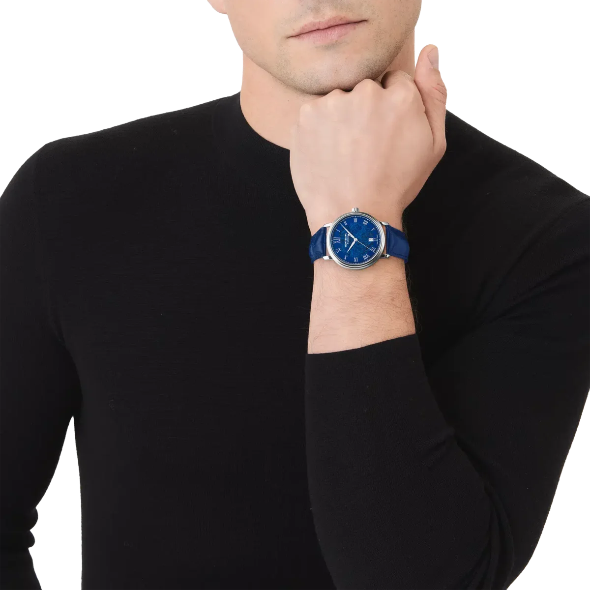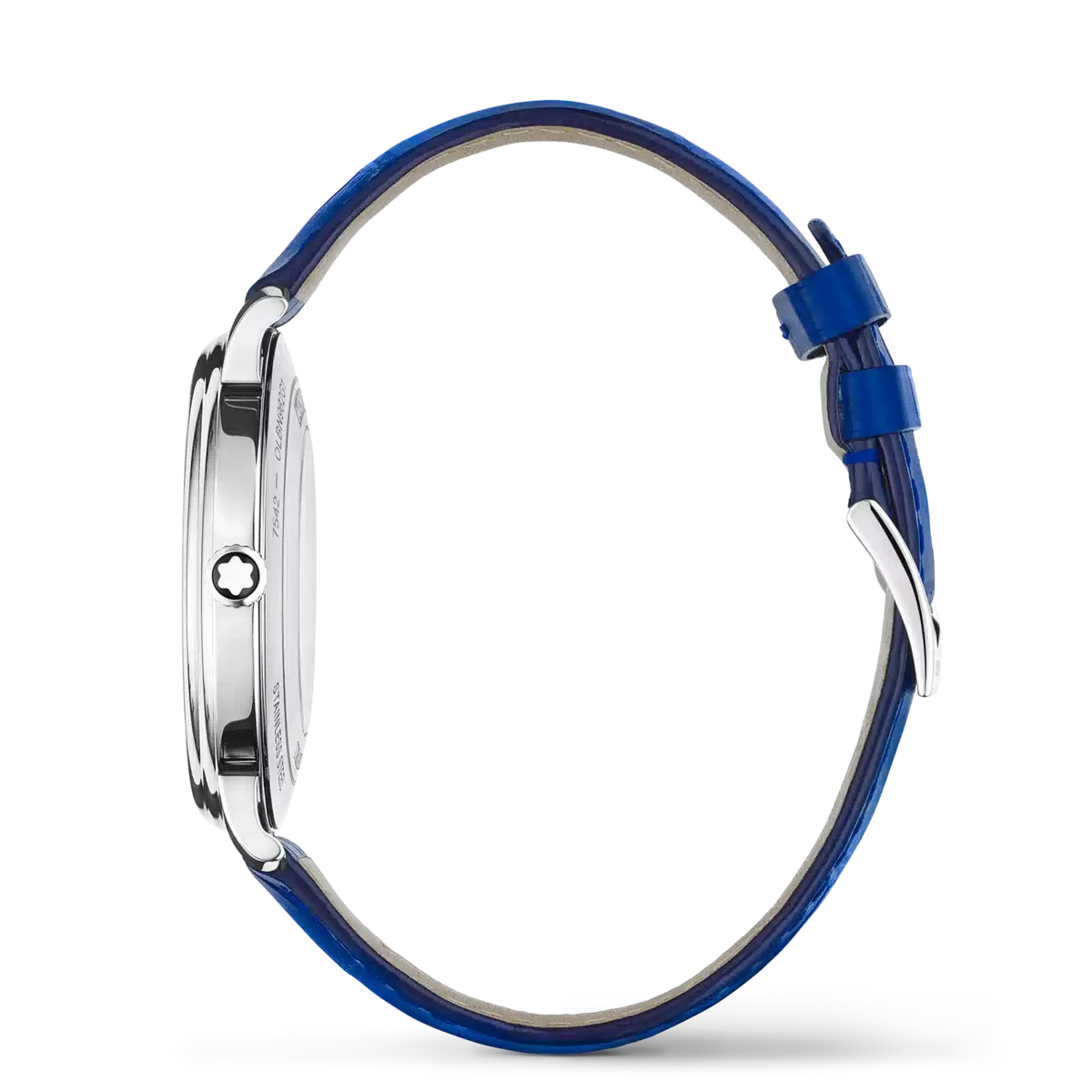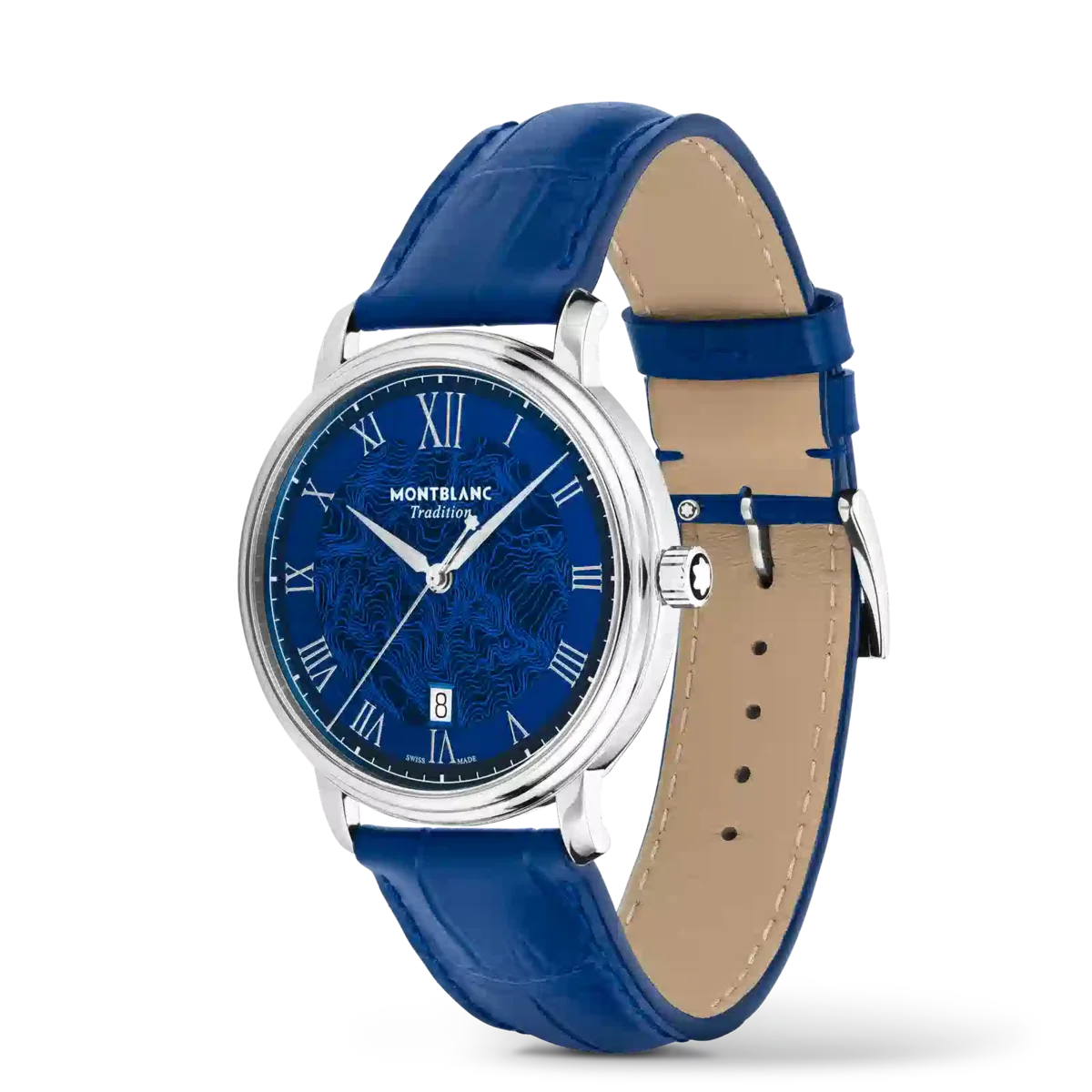 The Montblanc Tradition Automatic Date comes in a 40 mm stainless steel case with straight horns and a double-shaped bezel. The timepiece features a blue dial depicting the topography of the Mont Blanc with silver-colored Roman numerals and a prominent Roman “XII”. The sword-shaped hour and minute hands, the seconds hand and crown with Montblanc emblem and the blue interchangeable calf leather strap complete its contemporary elegant appearance.