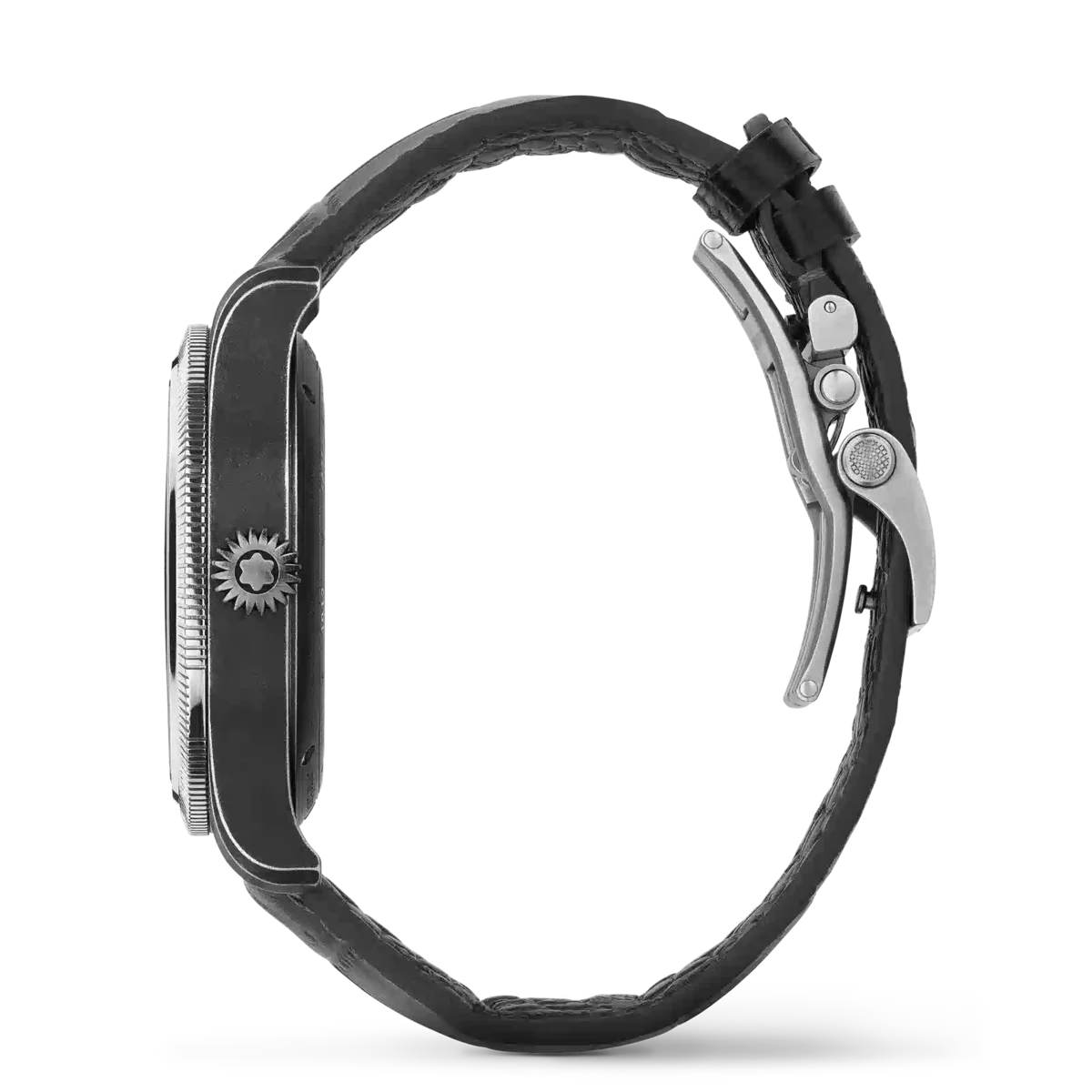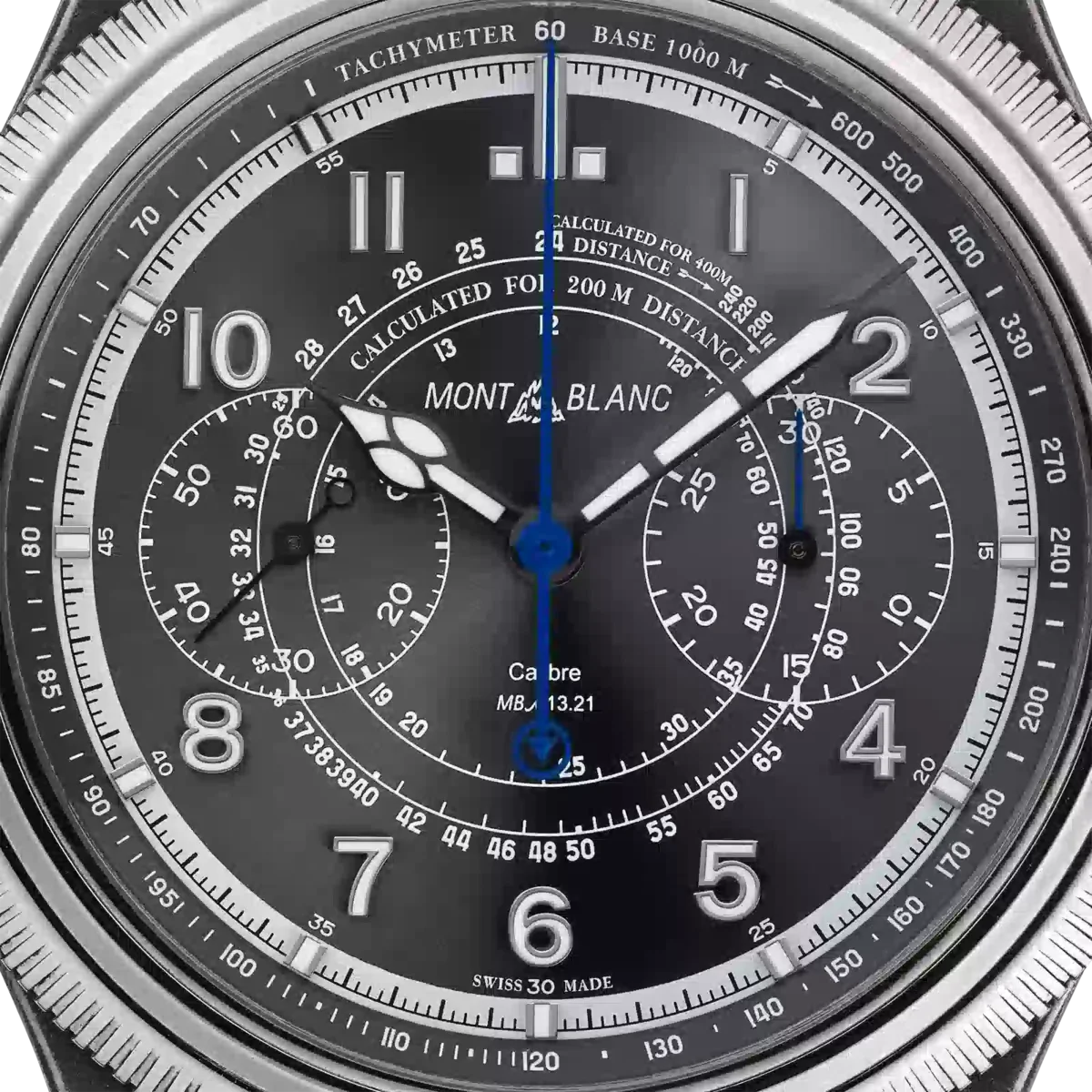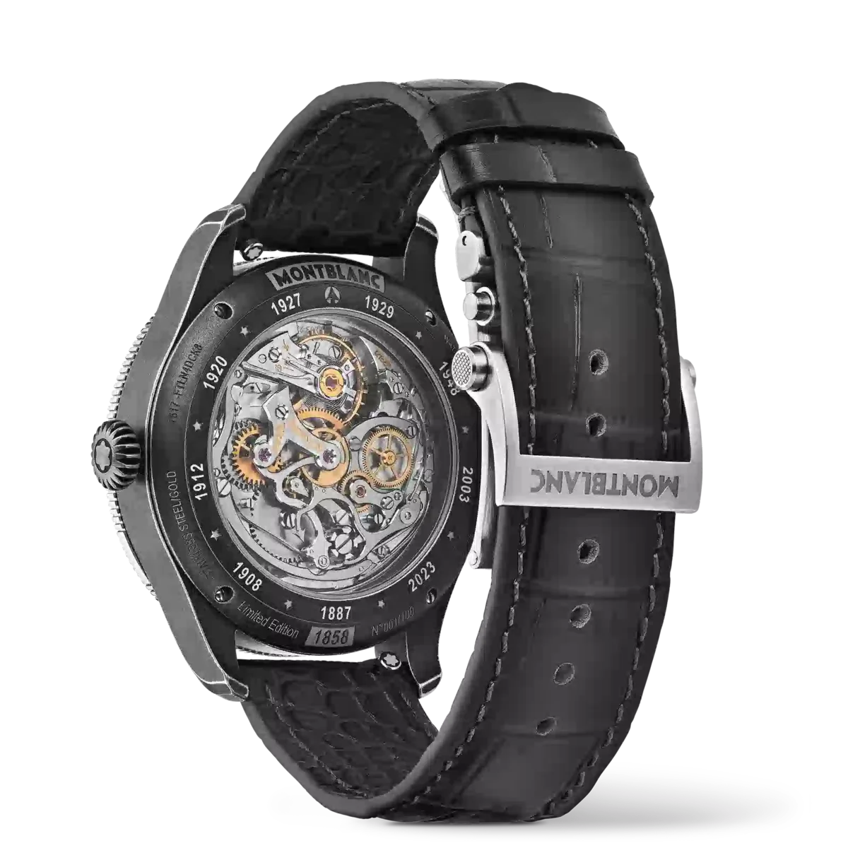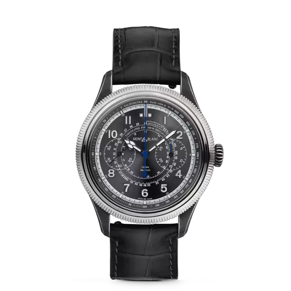 The Montblanc 1858 Unveiled Timekeeper Minerva Limited Edition rethinks the expected. Instead of using traditional pushers, the chronograph is activated via the fluted bezel. Just one click of the 750/1000 (18 karats) white gold fluted bezel will start the chronograph. A second click will stop it, and a third click will reset it, transforming the chronograph as we know it. The timepiece comes in a 42.5 mm distressed steel case and is fitted with a grey dial and a grey interchangeable calf leather strap with alligator print. It is powered by the hand-finished manually wound Manufacture MB M13.21 calibre and is limited to 100 pieces.